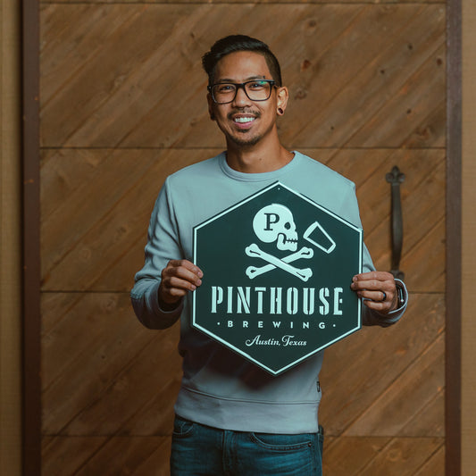 Pinthouse Brewing "Jolly Roger" Skull and Crossbones Tin Tacker Metal Beer Sign